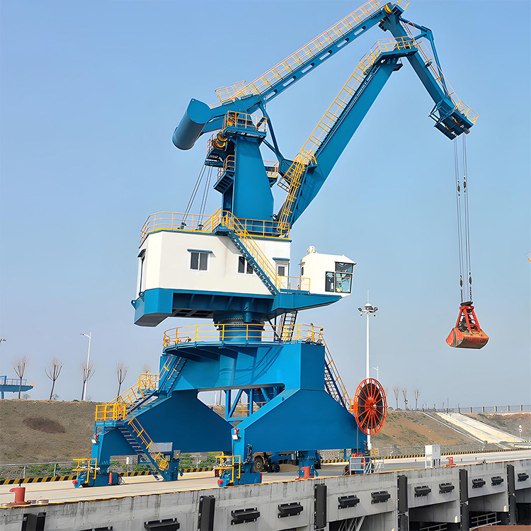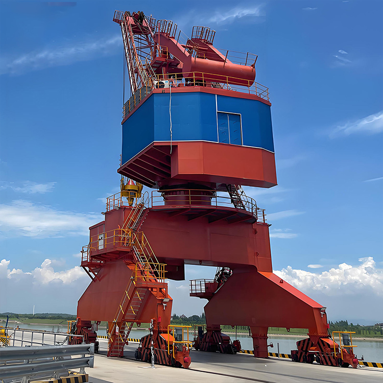 裝卸用門座起重機(jī):這是港口和大型露天堆場(chǎng)最常見的類型。主要用于裝卸件雜貨、散貨(煤炭、礦石)或集裝箱。其設(shè)計(jì)強(qiáng)調(diào)工作速度快、裝卸效率高。通過更換吊具(如換用集裝箱專用吊具或抓斗),可靈活適應(yīng)不同貨種,常被稱為“多用途門機(jī)”。