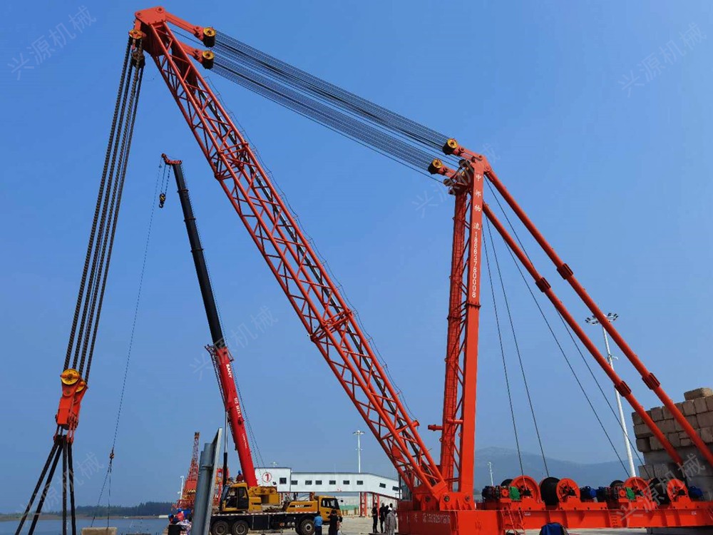 桅桿式起重機(jī)桅桿式起重機(jī),固定安裝的起重機(jī),一般用于港口碼頭桅桿式起重機(jī)又稱為拔桿或把桿,是最簡單的起重設(shè)備。一般用木材或鋼材制作。這類起重機(jī)具有制作簡單、裝拆方便,起重量大,受施工場地限制小的特點。 特別是吊裝大型構(gòu)件而又缺少大型起重機(jī)械時,這類起重設(shè)備更顯它的優(yōu)越性。但這類起重機(jī)需設(shè)較多的纜風(fēng)繩,移動困難。另外,其起重半徑小,靈活性差。因此,桅桿式起重機(jī)一般多用于構(gòu)件較重、吊裝工程比較集中、施工場地狹窄,而又缺乏其它合適的大型起重機(jī)械時。